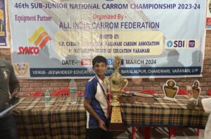 संगमनेर (नितीन भालेराव):-वाराणसी येथे ऑल इंडिया कॅरम फेडरेशनच्या वतीने घेण्यात आलेल्या ४६ व्या सब ज्यूनियर राष्ट्रीय कॅरम स्पर्धेत महाराष्ट्राच्या संघाने चमकदार कामगिरी केली.या स्पर्धेत दुहेरीत संगमनेरच्या ध्रुव भालेराव व रत्नागिरीच्या द्रोण हजारे या जोडीने सुवर्ण मिळवले.सलग पाच सामने जिंकत महाराष्ट्राच्या संघाने अंतिम सामन्यात धडक मारली.अंतिम सामन्यात उत्तरप्रदेश च्या संघाचा ३-0 असा पराभव केला.