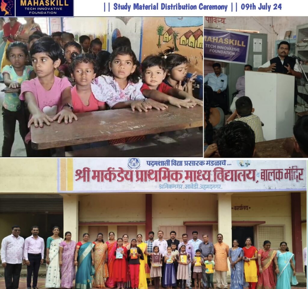 अहमदनगर (दि.९ जुलै):-महास्किल टेक इनोव्हेटिव्ह फाऊंडेशन तर्फे श्रमिकनगर येथील श्री.मार्कडेय प्राथ.माध्य.विद्यालय व बालक मंदिर शाळेमध्ये इयत्ता १ ली ते इयत्ता ७ वीच्या विद्यार्थ्यांना मोफत शैक्षणिक साहित्याचे वाटप करण्यात आले.शिक्षण घेत असतांना विद्यार्थ्यांना केवळ चांगली शाळा,शिक्षक मिळणे महत्वाचे नाही तर त्याच बरोबर शैक्षणिक साहित्य सुद्धा मिळणे महत्वाचे आहे. शासनाने मोफत पुस्तके सर्व शाळात पुरवली असली तरीही लिहिण्यासाठी वही आणि अन्य साहित्य खरेदी करण्यासाठी विद्यार्थ्यांना हजारो रुपये खर्च करावे लागतात आणि दुदैवाने काही विद्यार्थ्यांना हे शैक्षणिक साहित्य वेळेवर उपलब्ध होत नाही.